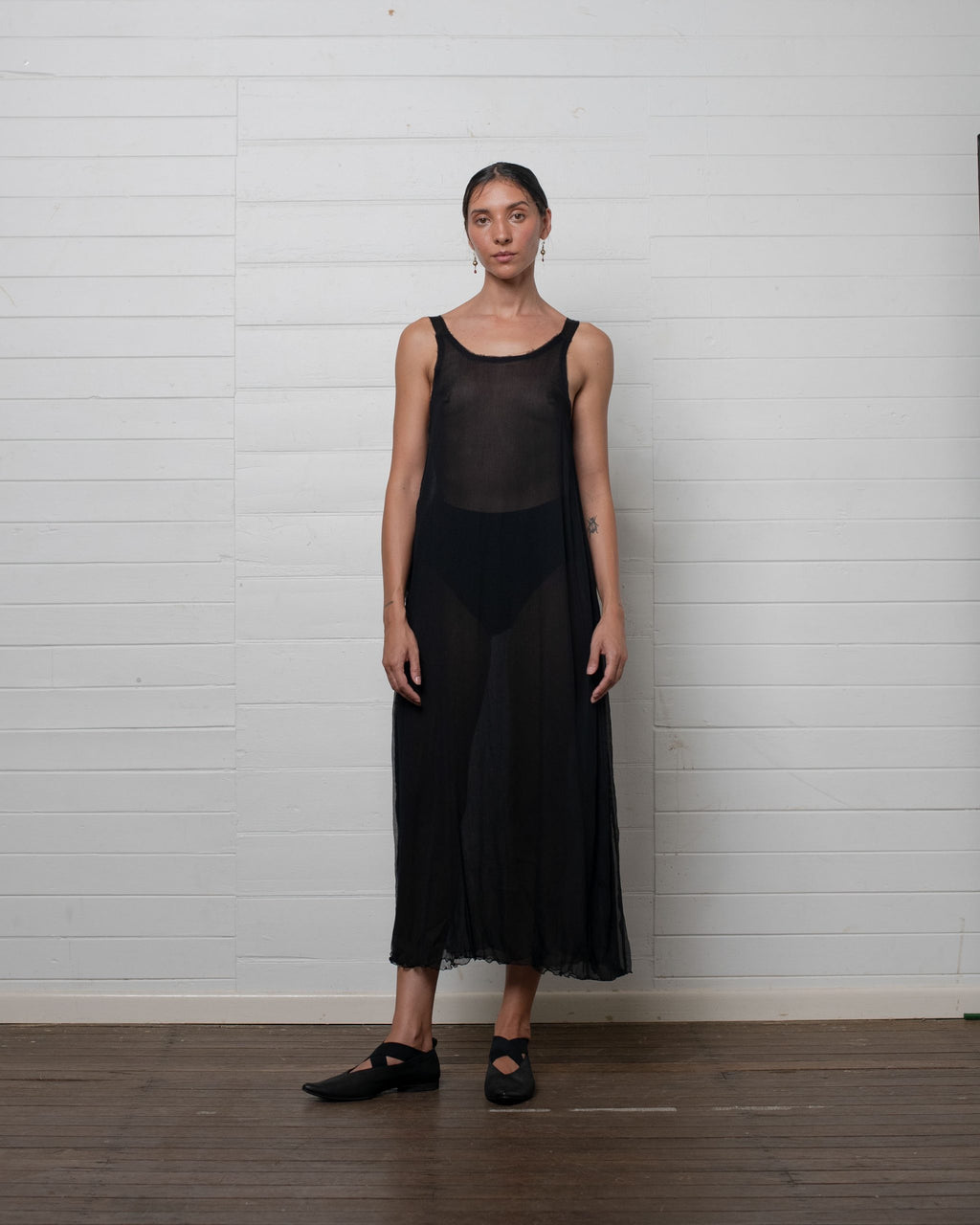 The Crinkle Chiffon A-Line Tank Dress is a lightweight essential, cut in double-layered 100% silk chiffon for effortless movement. Designed for layering or worn over a swimsuit, it drapes softly with a relaxed silhouette that balances ease with understated elegance.